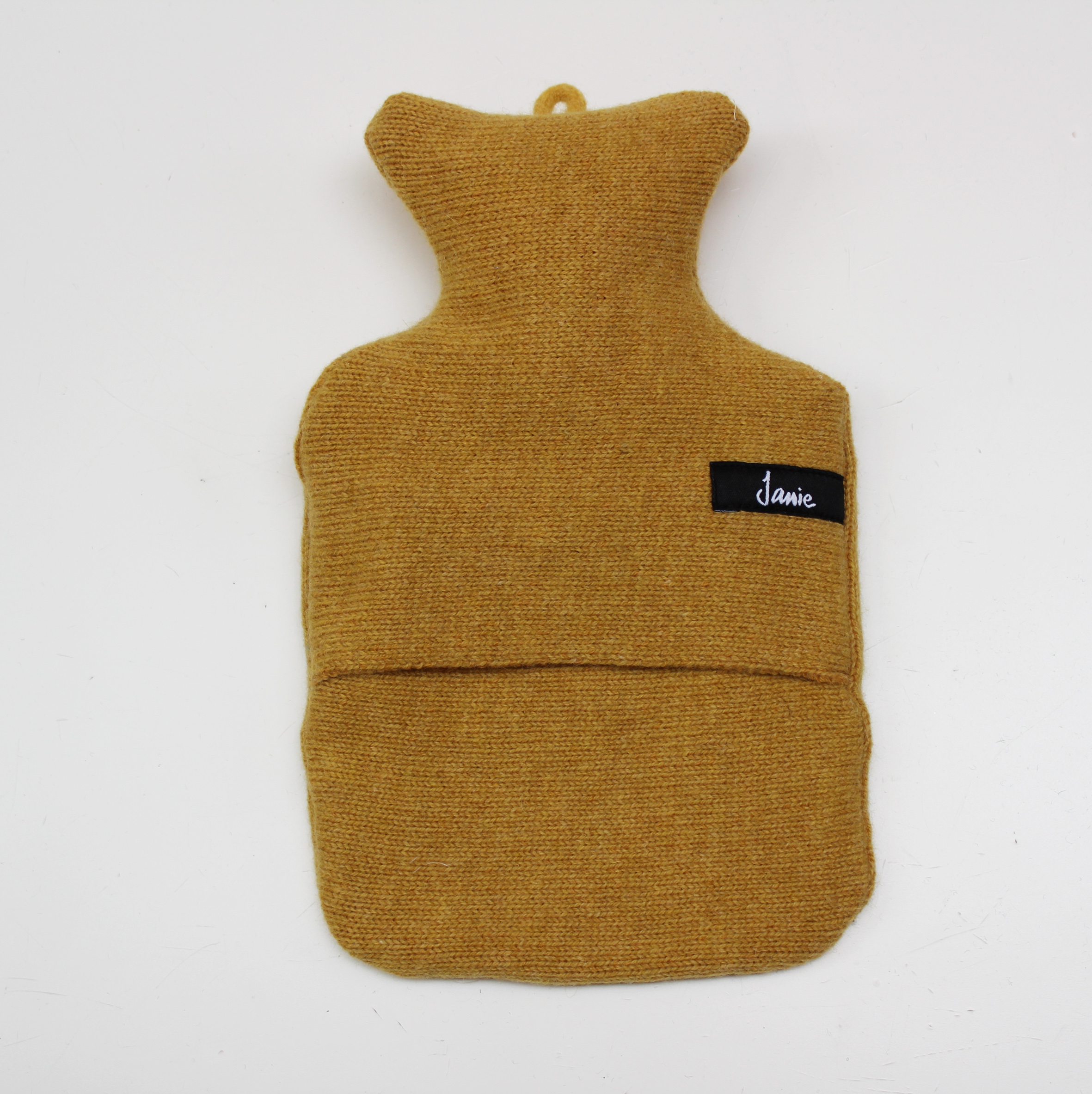 Daisy 500 ML hot water bottle featuring free stitching and hand embroidery in 100% merino wool knit in a soft shade of Gold. Overlapped opening to remove/fill bottle